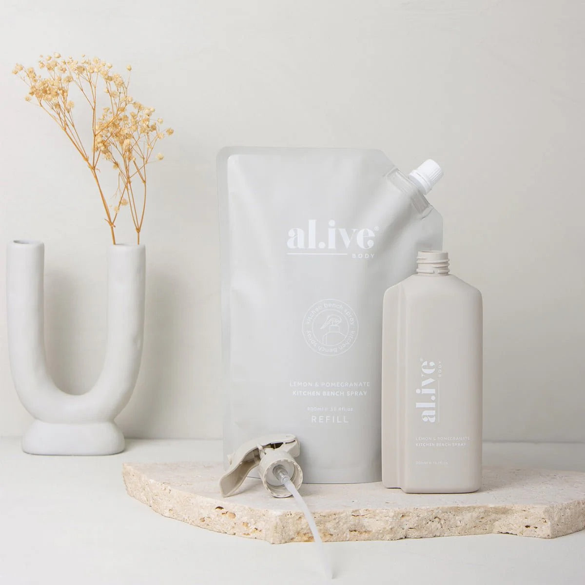 The al.ive body Lemon & Pomegranate Kitchen Bench Spray features natural surfactants and fruit extracts, the formula dissolves dirt and grime for easy removal.