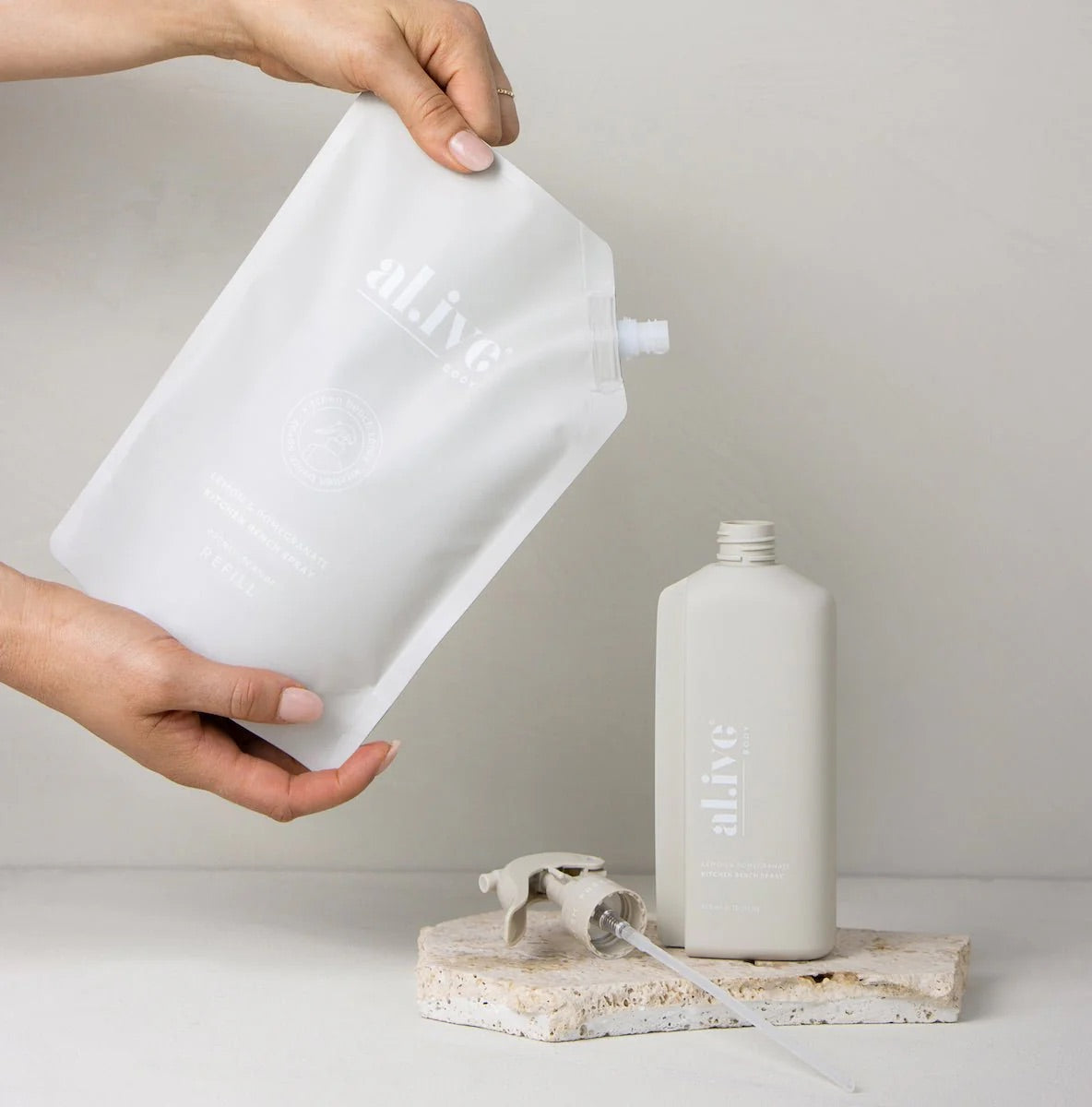Our refill pouches are designed to refill your existing al.ive kitchen bottles whilst helping to reduce the amount of plastic used. Our refill pouches use 85% less plastic and refill your 300ml al.ive body bottle three times.
