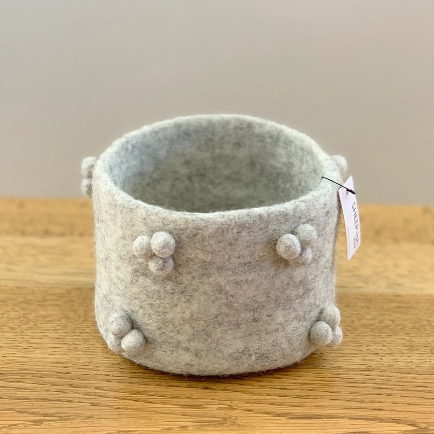Designed to fit a 12cm pot plant. Ethically handmade in Nepal using 100% NZ Wool, decorated with small clusters of wool felt balls