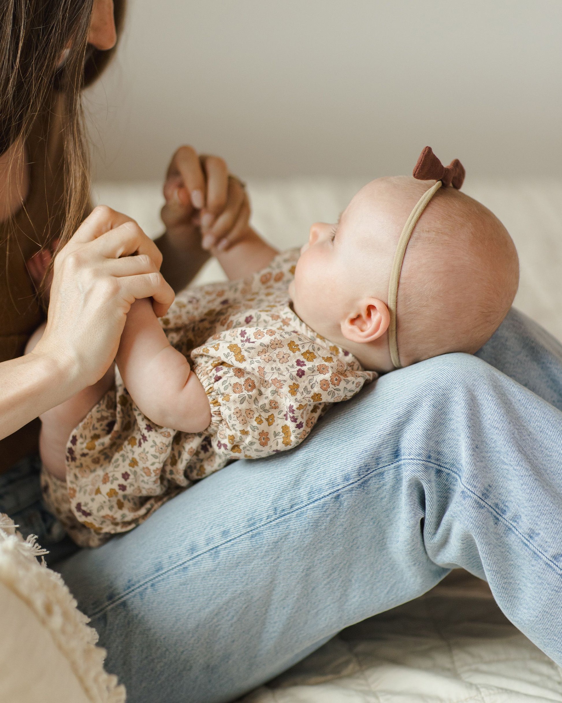 Our Francy Set features an empire waist dress with balloon sleeves and a coconut button keyhole. It also includes matching baby bloomers.