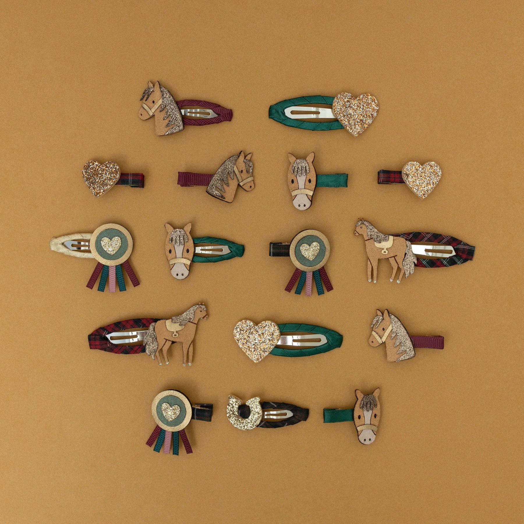 - Horses and hearts crafted from soft suedette, glitter and metallic fabrics
