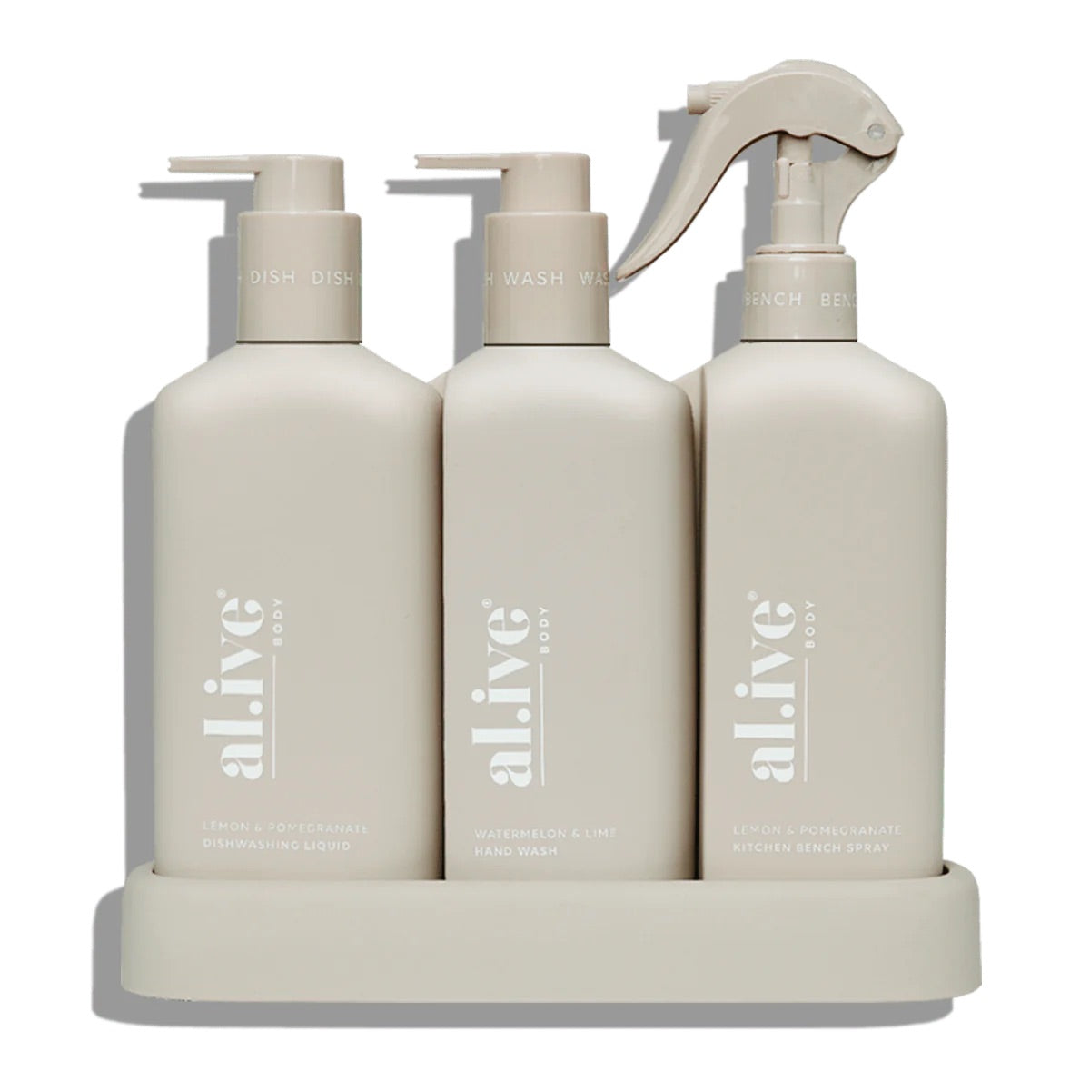 The al.ive body Dishwashing Liquid, Hand Wash & Bench Spray Kitchen Trio is a beautiful yet practical product, elegantly packaged to elevate your countertop.