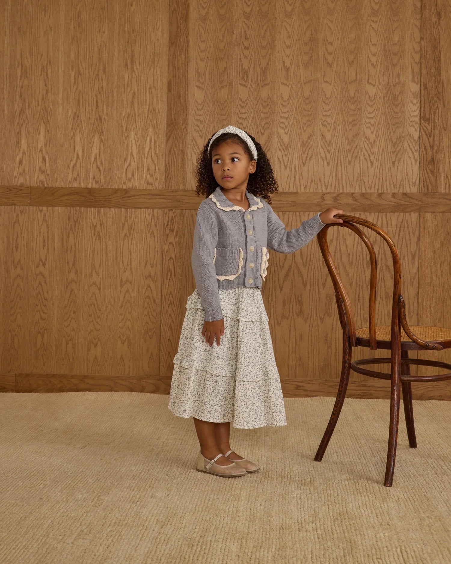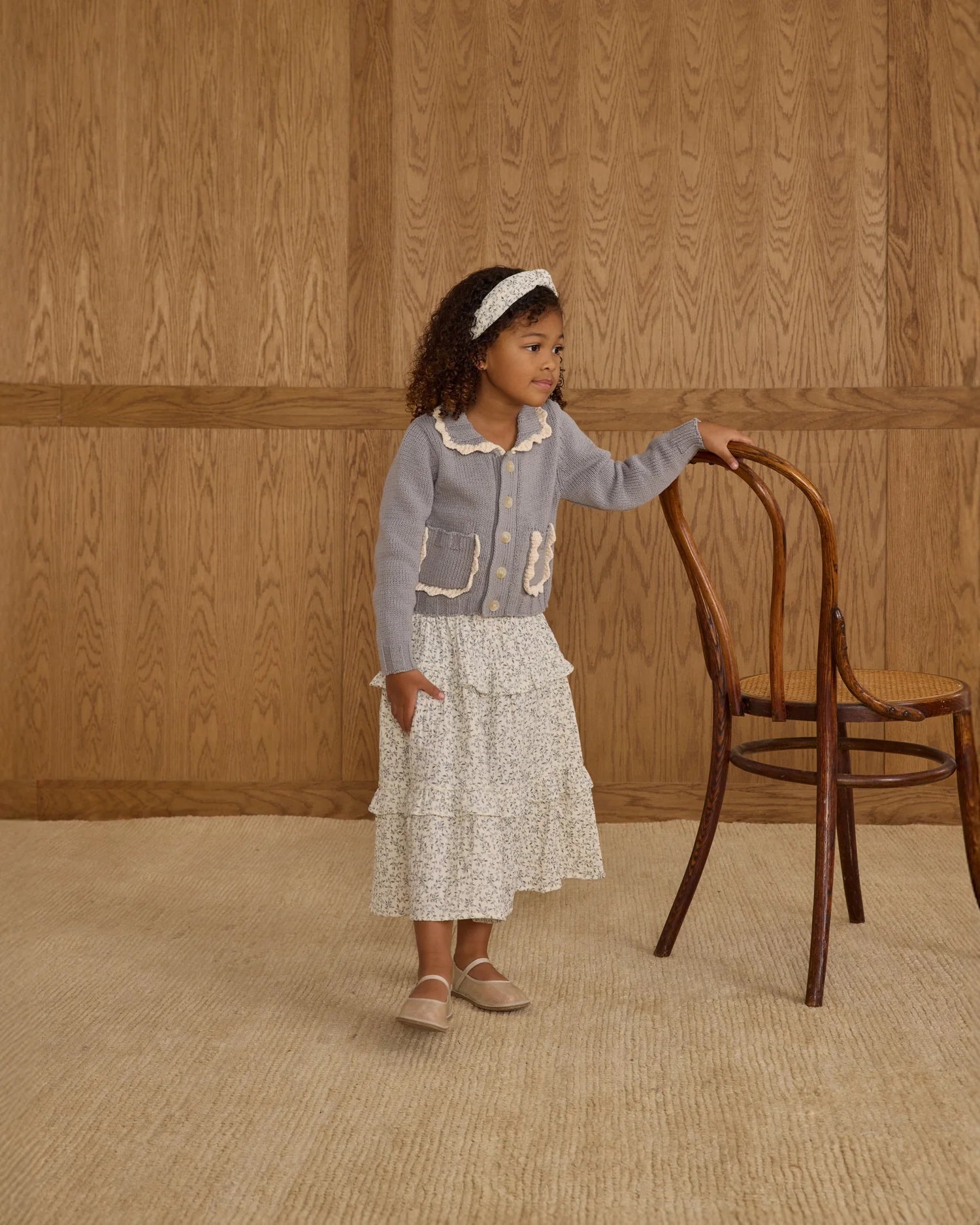 This midi skirt features tiered layers with delicate ruffle trim and a comfortable elastic waistband.